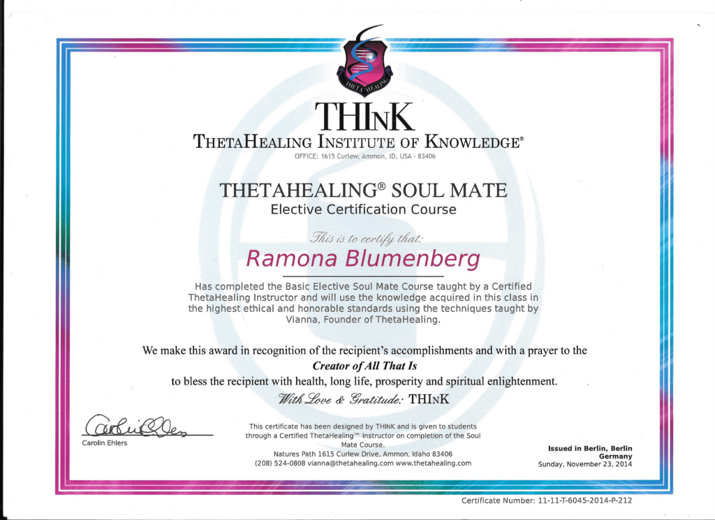 Ich erlernte die wundervolle, geistige und energetische Heilmethode Theta Healing, die ich in verschiedenen Bereichen vertiefen konnte.